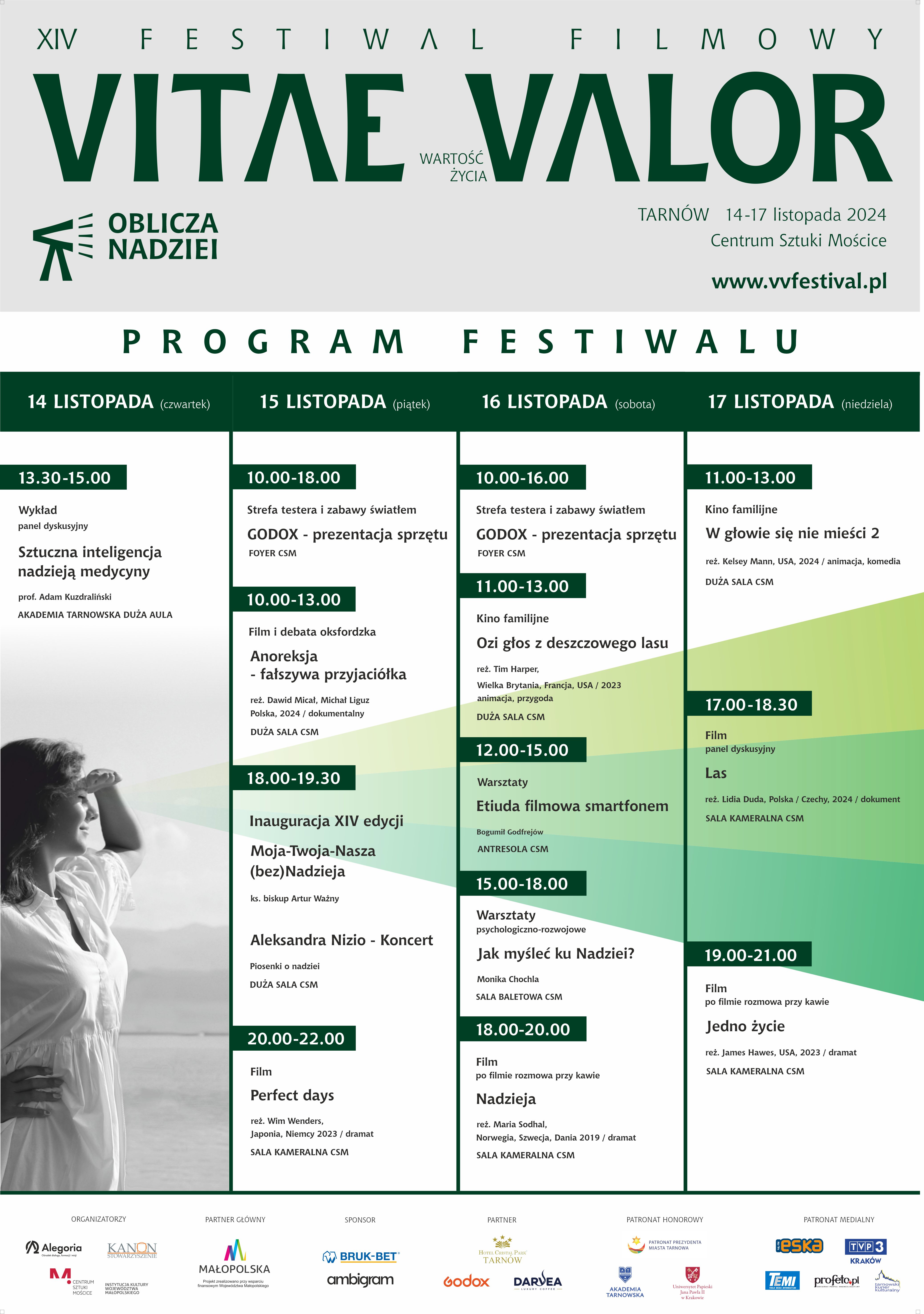 „Oblicza nadziei” zostaną ukazane w sześciu filmowych historiach, które dają światło w zwyczajnej codzienności i trudnych momentach życia. Wśród nich znajdą się „Perfect Days” (2023), „Nadzieja” (2019), „Jedno życie” (2023), „Las” (2024), a dla dzieci przygotowano dwa seanse: „Ozi: głos deszczowego lasu” (2023) i „W głowie się nie mieści 2” (2024).